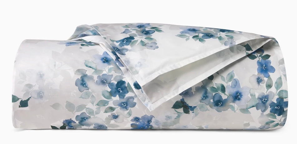 Soothing water color floral in blues, greens and purple on white percale printed and finished in Italy then constructed in USA. The duvet cover is self-reversing with a plain hem. Shams have a 1" flange. Sheet sets and boudoir pillows are available to order and are available in several coordinating colors of embroidered stripe on white percale t...