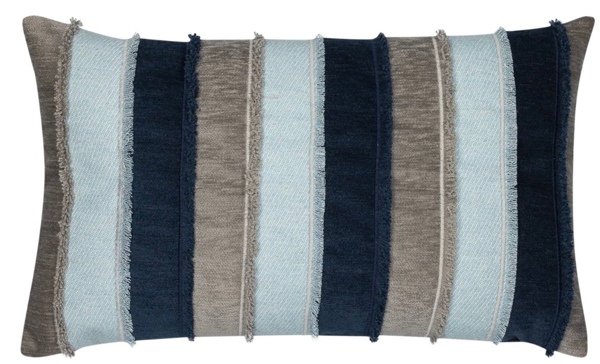 The hand-crafted Vista pillow evokes the rugged elegance of the American frontier. Soft textures of rich velvet in a palette of blue and gray create a cozy yet luxurious feel.