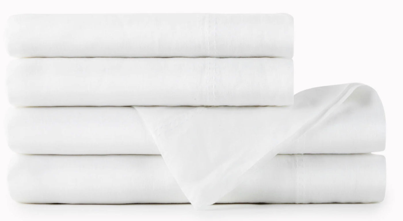 Made from 100% extra-long staple cotton in Portugal. The Soprano Sateen Sheeting Collection are soft, breathable and durable. Flat sheet and pillowcases feature a single row satin stitch embroidery on the hem - both have a 4" cuff Also available as duvets and shams!